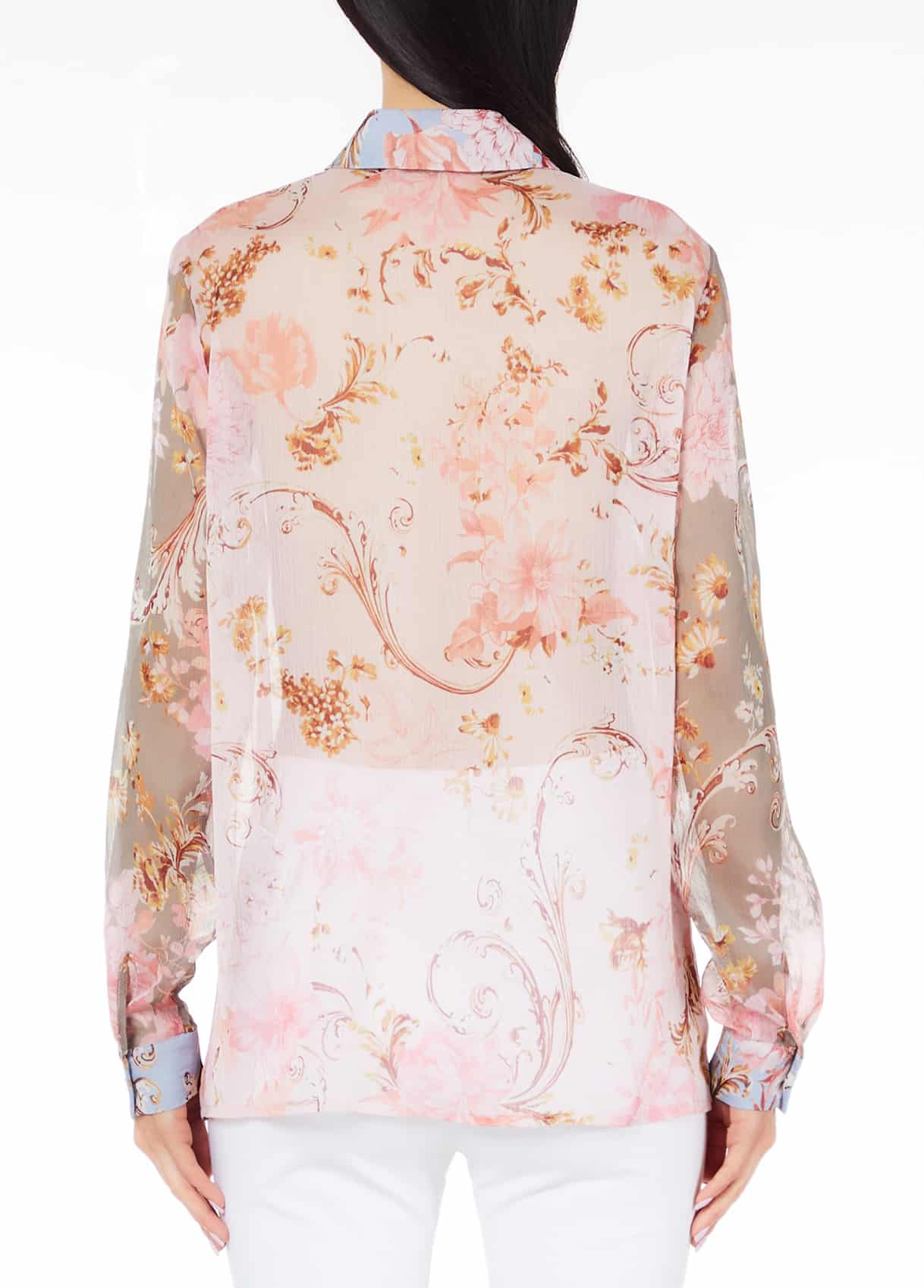 La camicia in creponne con stampa patchwork floreale all-over celebra la natura e lo stile contemporaneo. Il colletto alla francese e le maniche lunghe aggiungono eleganza, mentre i polsi con bottone e la chiusura con bottoni offrono praticità e raffinatezza.